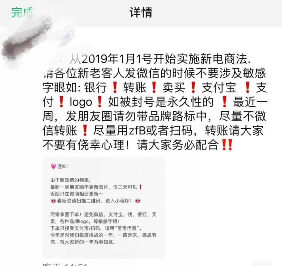 新《电商法》虽然没有对微商、个人代购的监管没有出具体细则,代购圈内却已流传了多个监管措施版本,比如“敏感字眼交易双方封号”、“不能微信直接付款”、“朋友圈限流和降权”等。