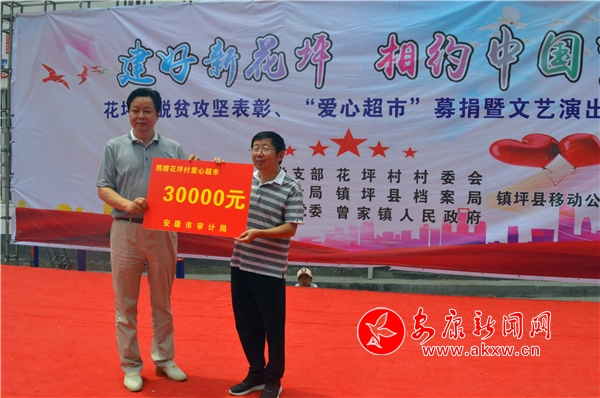 安康新闻网讯(通讯员 陈东青)7月26日上午,镇坪县曾家镇花坪村人声鼎沸,比三伏天的酷暑更加火热,比过春节的气氛更加热烈。由市审计局、镇坪县档案局、县移动公司等市县帮扶部门协办的花坪村脱贫攻坚表彰大会暨爱心超市募捐活动正在村委会前的活动广场举行。会上对花坪村的“致富带头人”“勤劳致富模范”等脱贫攻坚和“五净家庭”“孝老爱亲模范”“好媳妇”“优秀共产党员”等践行新民风典型进行了表彰奖励。活动现场还为村上爱心超市募集捐款10.4万元。