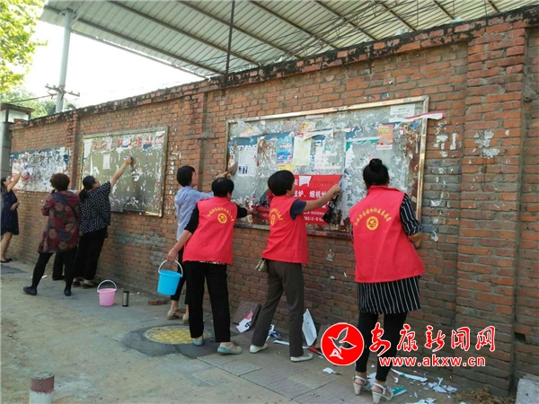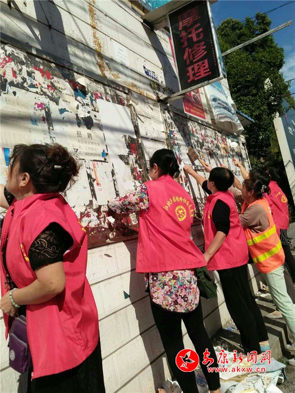 后张岭社区组织志愿者、低保户和保洁员对辖区的小野广告进行集中清理。