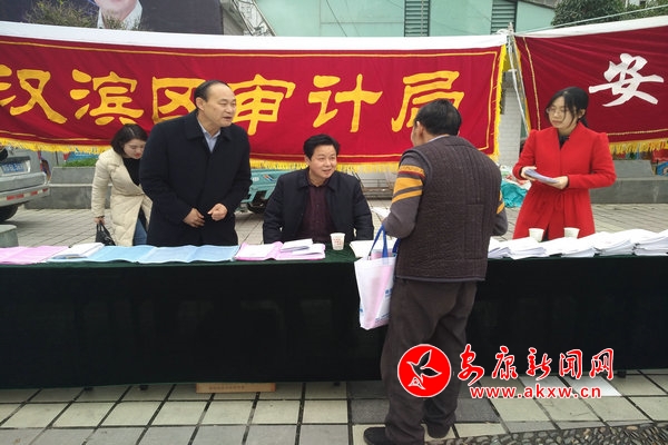 在市中心广场,市、区两级审计工作人员布置活动展板,悬挂宣传横幅,搭建宣传咨询点。在宣传活动中,审计人员向过往的群众发放《中华人民共和国宪法 (最新版)》《安康市村(社区)主要负责人经济责任审计暂行办法》《安康市行政效能审计办法(试行)》《党政主要领导干部和国有企事业人员经济责任审计规定》等法治法规宣传读本。当天,共接待咨询群众100余人次,发放各种宣传资料200余份。