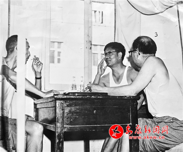 1983年8月中旬,安康日报社社长张成彬(右,已病逝)与陕西日报社高级记者元树德(中)、张运德在互通新闻信息。