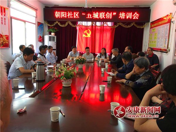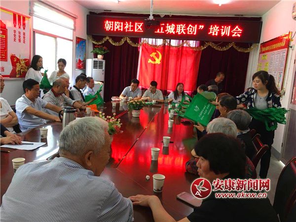 朝阳社区召开“五城联创”培训会。并对参会人员发放宣传环保袋、纸杯等。
