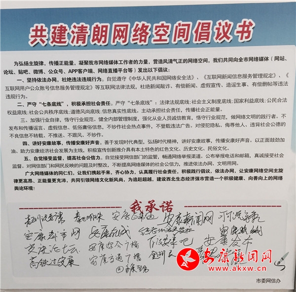 广大网络媒体的同仁们,让我们携起手来,齐心协力,认真履行社会责任,积极践行倡议,依法办网,让安康网络空间主旋律更高昂、正能量更充沛,共同引领网络文化新风尚,为追赶超越,建设西北生态经济强市营造一个积极健康、向善向上的网络舆论环境!