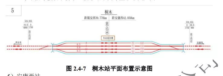 车站初始规3台8线布置,远期随天水一十堰铁路引入预留1台2线(PS:另一条高铁过境安康,美),总规模4台10线。到发线有效长650m,设岛式站台(450×12×1.25m)4座,设旅客进出站地道2座(宽12m)。