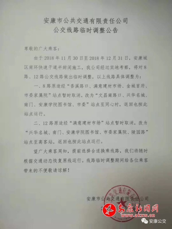 12路原途经“满意建材市场”站点暂时取消,改为“兴华名城、南门、安康学院图书馆、市委家属院、陵园路”站点至高客站,返回也按此站点运行。5zB安康新闻网