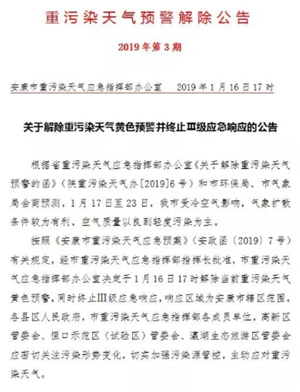 按照《安康市重污染天气应急预案》(安政函〔2019〕7号)有关规定,经市重污染天气应急指挥部指挥长批准,市重污染天气应急指挥部办公室决定于1月16日17时解除当前重污染天气黄色预警,同时终止Ⅲ级应急响应,响应区域为安康市辖区范围。各县区人民政府,市重污染天气应急指挥部各成员单位,高新区管委会、恒口示范区(试验区)管委会、瀛湖生态旅游区管委会应密切关注污染形势变化,切实加强污染源管控,主动应对重污染天气。