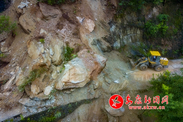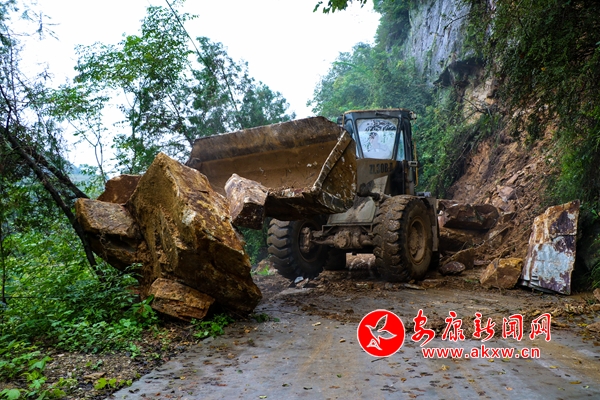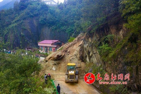连日来的持续强降雨导致汉滨区境内农村公路水毁比较严重,多处路段相继发生山体滑坡。灾情发生后,汉滨区农村公路管理局立即组织30余台大型机械进行抢险,目前已抢通道路40条,还有5条正在抢通中。9月18日,一台机械正在清理受灾道路的垮塌土石。(记者 张乔 通讯员 张昊 摄)vN7安康新闻网