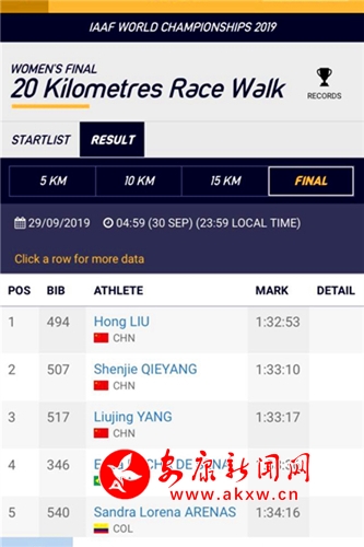 本报讯(记者 魏涛 通讯员 章理)9月30日,在2019年多哈田径世锦赛女子20公里竞走决赛中,中国队包揽前三名。现世界纪录保持者刘虹以1小时32分53秒获得冠军;名将切阳什姐获得亚军,安康籍运动员杨柳静以1小时33分17秒获得季军,这是中国田径队历史上第一次在世锦赛单项目上包揽前三。