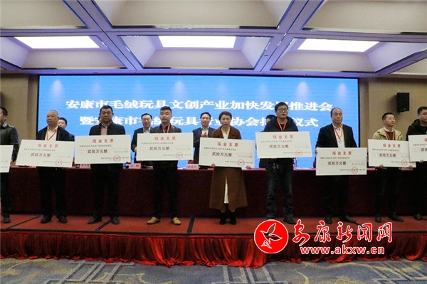 会上,赵俊民与于福亮共同为安康市毛绒玩具行业协会揭牌,协会新当选会长沈爱华作表态发言。会议还向30余家企业兑现了毛绒玩具文创产业发展基金奖励。