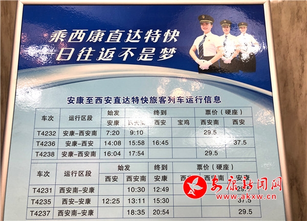 此次新增开的直达特快,从2020年1月10日起,安康至西安南每日开行3对,早上、中午、下午各1对,具体时刻为:T4232次安康早上7:20开、西安南9:10到;T4236次安康中午14:08开、西安南15:58到、西安16:45到;T4238次安康下午16:04开、西安南17:54到。在票价方面,本次直达特快安康至西安南间硬座票价29.50元,安康至西安间硬座票价37.50元。3对直达特快提供硬座、软卧、硬卧不同席位,以满足不同旅客出行需求。