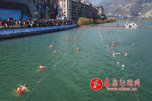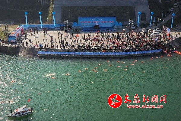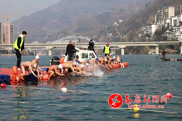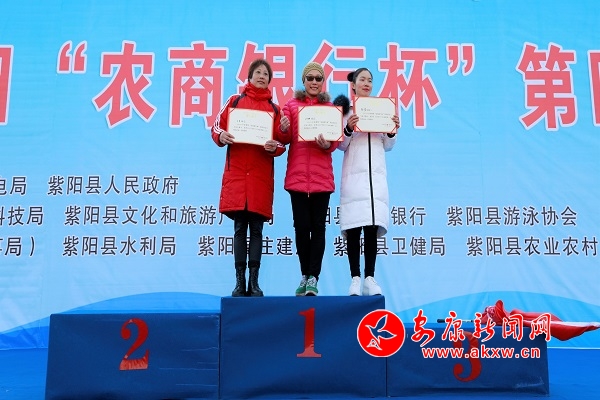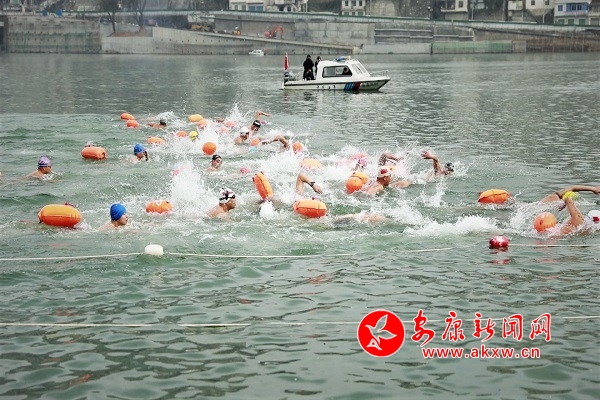 本网讯(记者 李俊 实习记者 刘攀)12月29日,紫阳“农商银行杯”第四届汉江冬泳大赛在紫阳县亲水广场公开水域举行。来自重庆、四川、湖北、陕西等四个省32支代表队的600余名冬泳爱好者齐聚紫阳,畅游汉江。