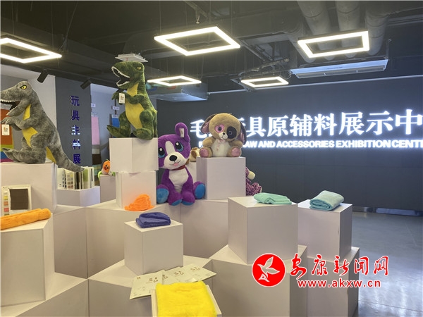 分原辅料展示区、洽谈区、办公区、仓储区四部分。主要展示和供应毛绒玩具生产所需面料和填充物,保障毛绒玩具原材料的供给满足产品生产需求,实现一站式采购,建设全市毛绒玩具原材料生产批发中心。
