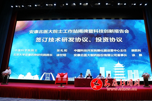会上还签订了院士技术研发合作协议和投资合作协议。在随后的科技创新报告会上,北京大学药学院教授刘俊义、北京大学安康药物研究院教授徐世明和中国科技开发院孵化器运营中心主任颜胜利分别作了学术报告。市直有关部门负责同志、安康北医大合作企业代表以及安康学院师生代表等300余人现场聆听学习。