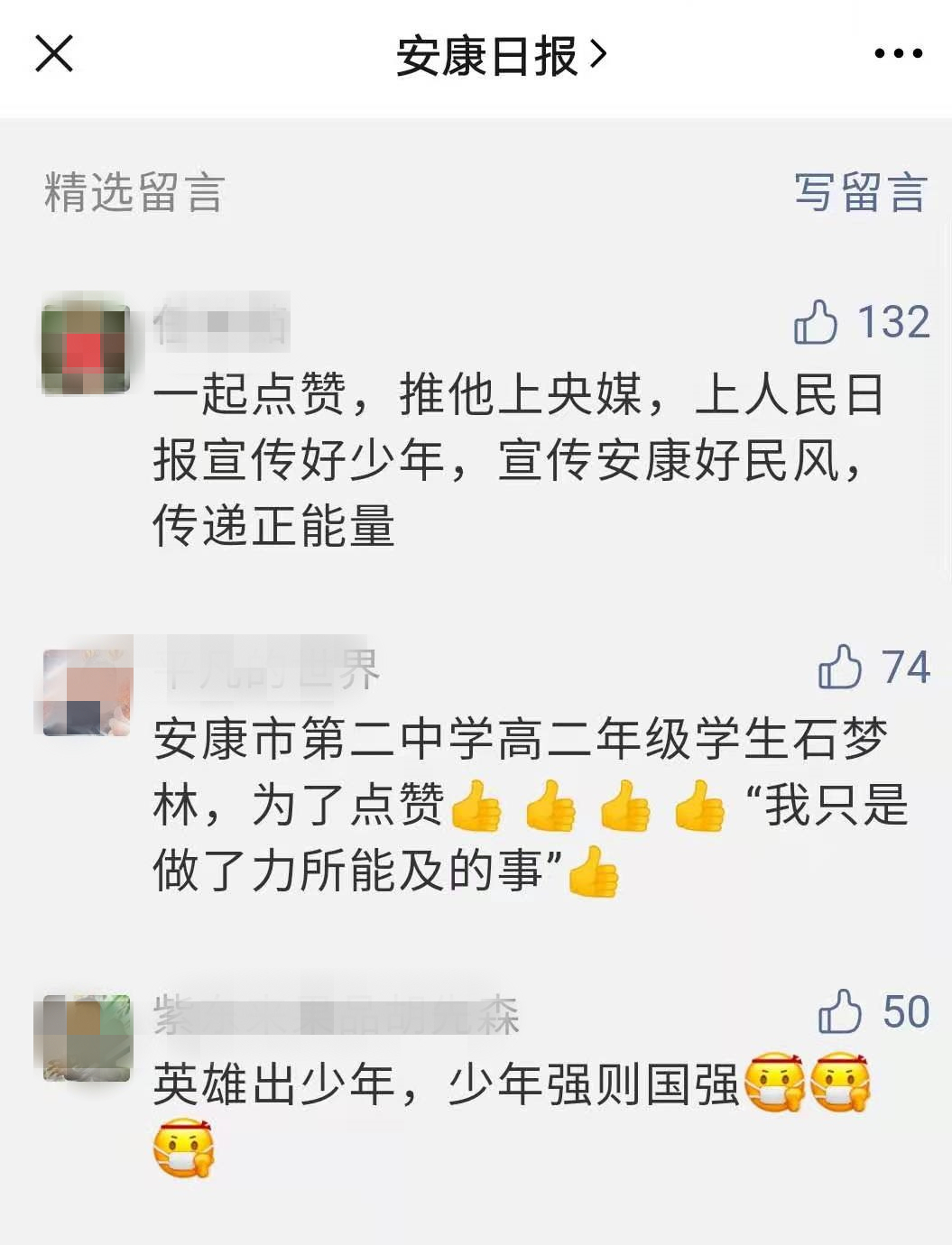 还有网友留言称,“推他上央媒,上人民日报宣传好少年,宣传安康好民风,传递正能量”,@这位网友,你的愿望实现啦!