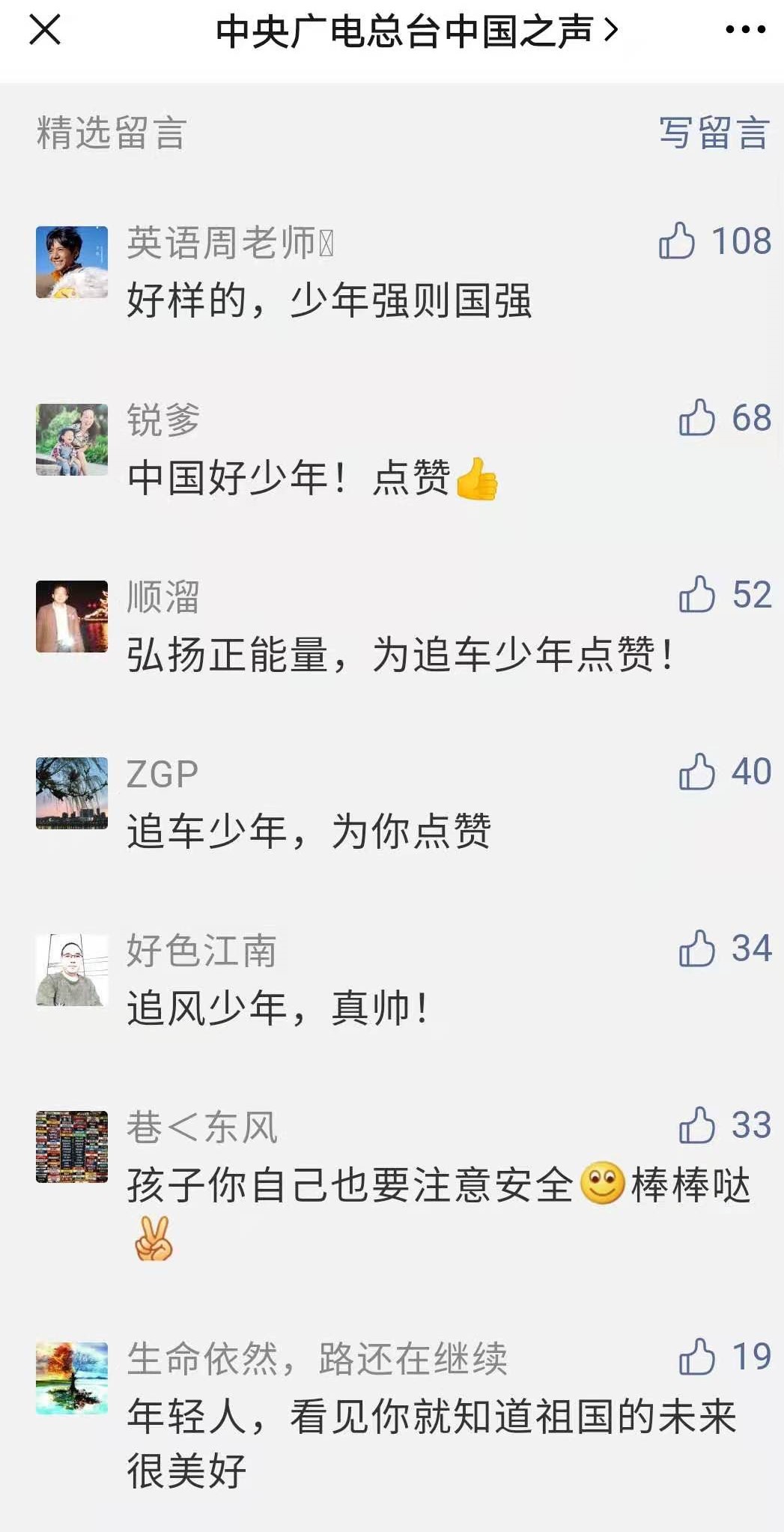 新华网、央视新闻、中央广电总台中国之声等多家央媒关注报道安康这名“追车少年”,赞扬他的善行义举,网友纷纷留言:“少年强则国强”,“看到你就知道祖国的未来很美好”……