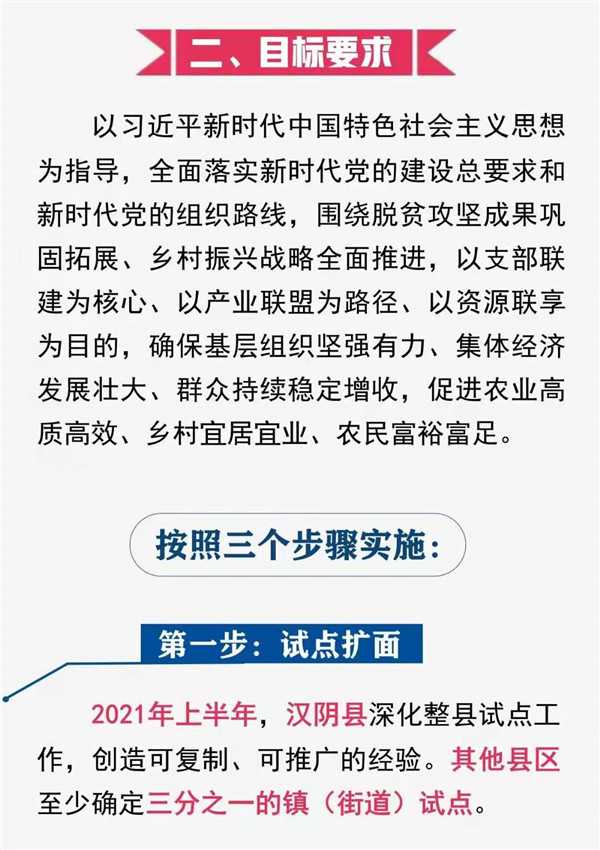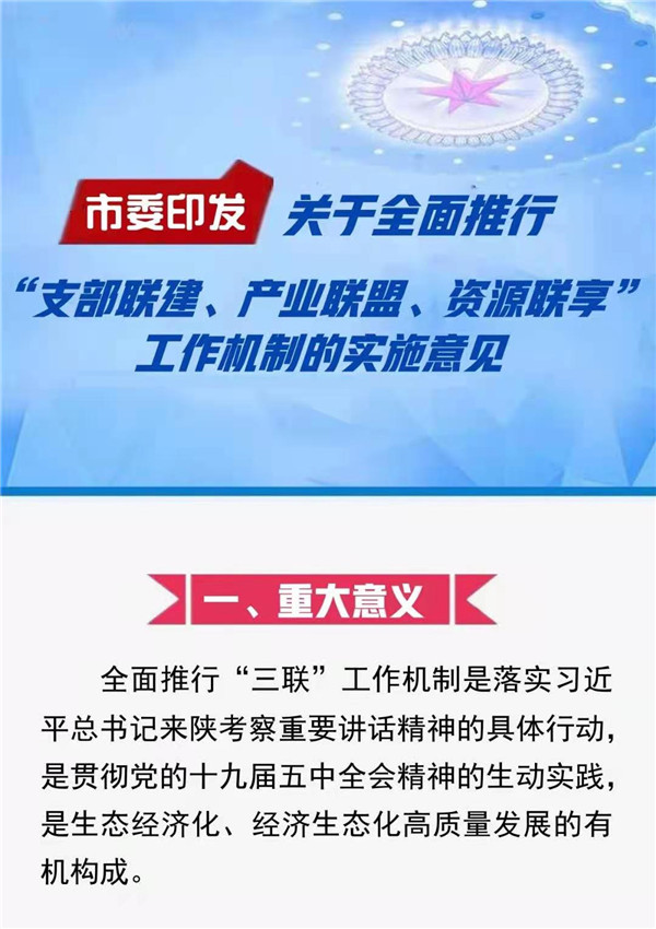为深入贯彻落实习近平总书记来陕考察重要讲话精神,实现巩固拓展脱贫攻坚成果与乡村振兴有效衔接,以高质量基层党建保障高质量发展,按照市委四届十次全会要求,在总结汉阴等县区试点经验的基础上,现就全面推行“支部联建、产业联盟、资源联享”(以下简称“三联”)工作机制,提出如下实施意见。r3V安康新闻网