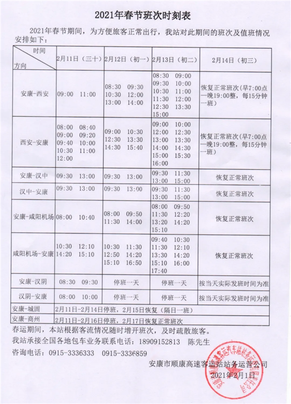 2021年春节期间,为方便旅客正常出行,安康高客站大巴班次将作出以下调整: