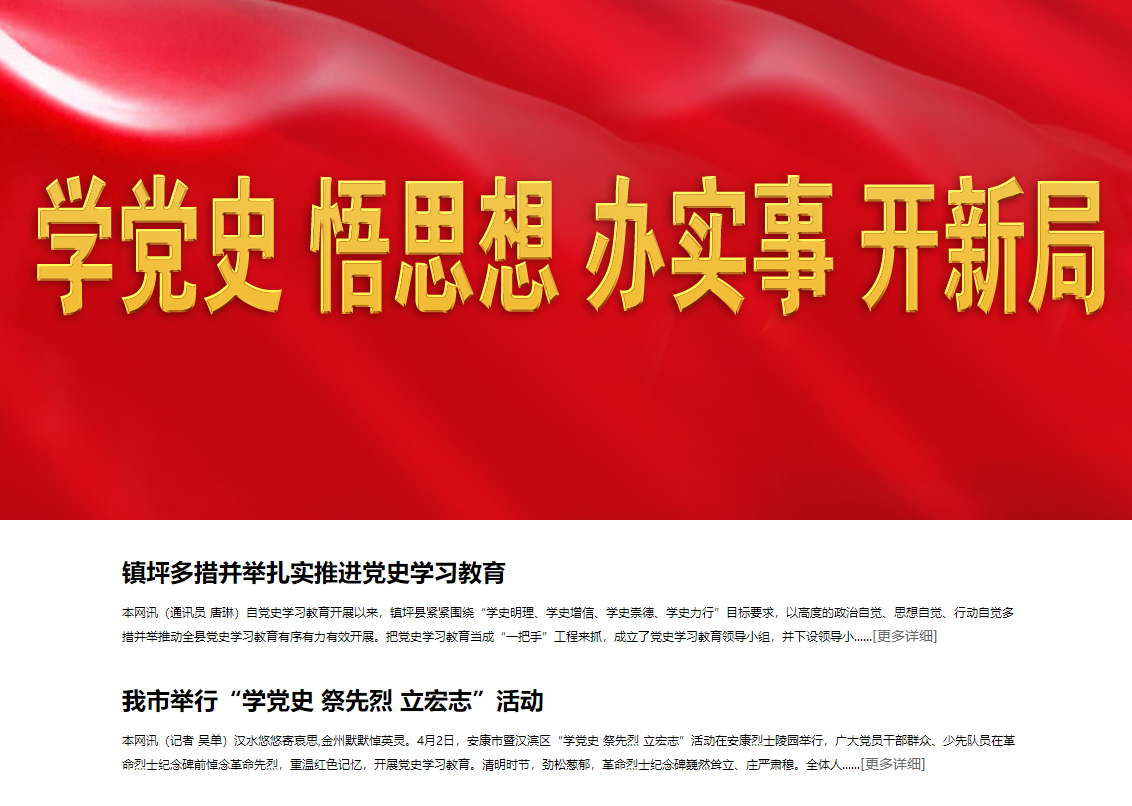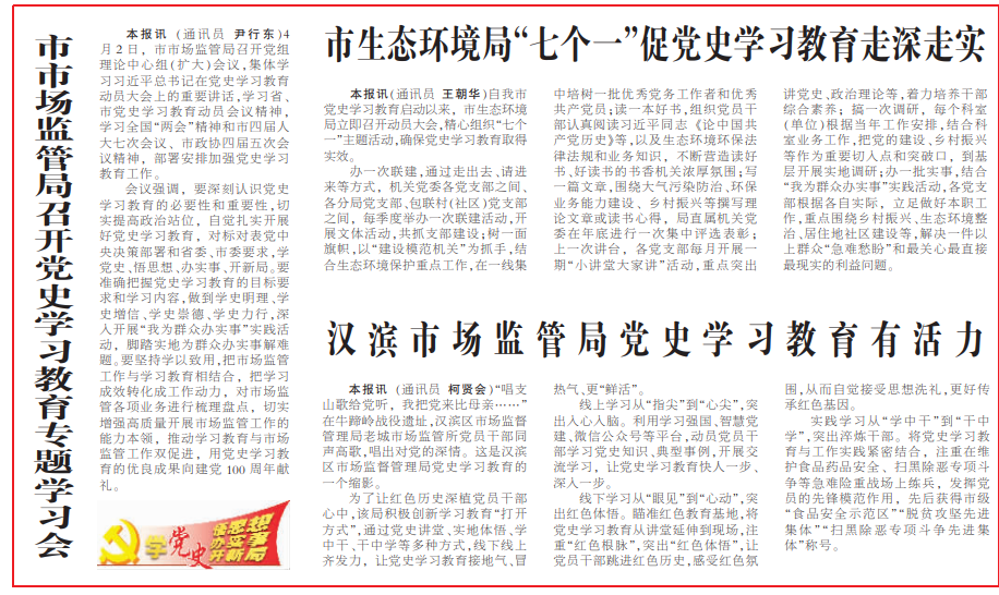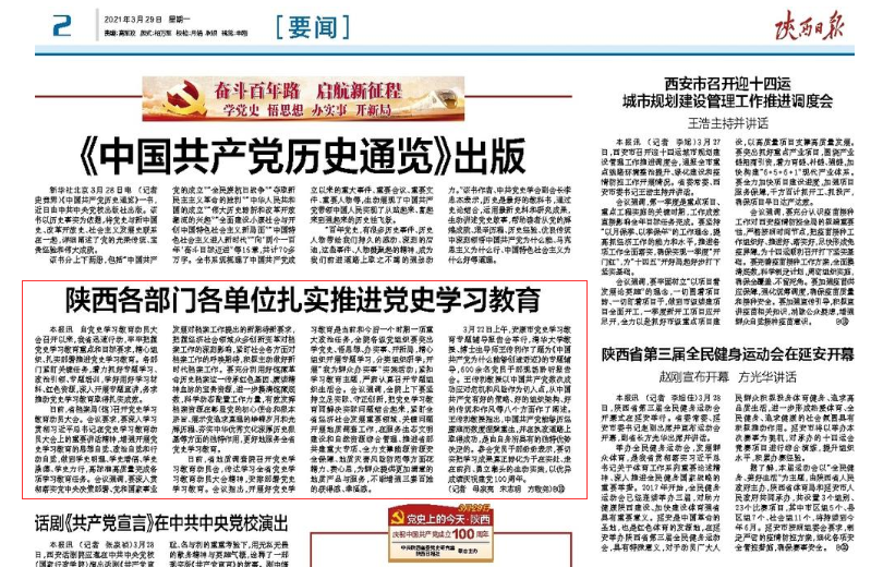 《安康日报》在及时转载新华社关于中央开展党史学习教育有关活动的同时,主动跟进报道我市党史学习教育系列安排部署。《安康日报》及时开设“学党史 悟思想 办实事 开新局”专栏,刊发全市党史学习教育动态。截至目前,《安康日报》和安康新闻网开设“党史上的今天”、“庆祝中国共产党成立100周年”、“学党史、悟思想、办实事、开新局”、“奋斗百年路 启航新征程”等报纸和网站及微信公众号、视频号专栏6个,刊发全市党史学习教育动态报道和理论文章300余篇,其中《习近平总书记党史学习教育动员大会上的重要讲话在我市引起热烈反响》《党员干部心中植下“三棵树” 》《在学党史中增强“三力”》等一批稿件产生积极影响。