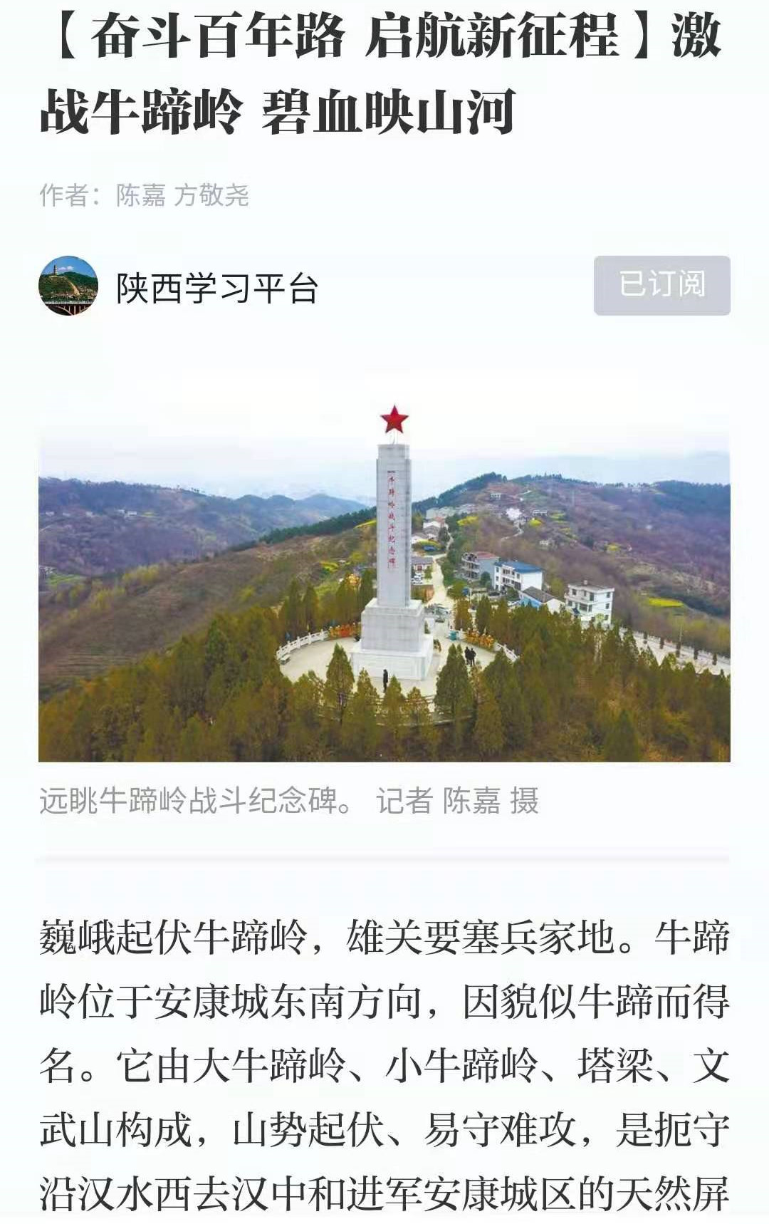 3月29日以来,《陕西日报》以《全省各部门各单位扎实推进党史学习教育》为题,对我市举行首场党史学习教育专题报告会进行了报道。紧接着,“学习强国”推出了《陕西安康市汉滨区:忠魂千秋耀山乡 慷慨奋进著新篇》《激战牛蹄岭 碧血映山河》两篇报道。陕西广播电视台、群众新闻网、西部网集中播出我市策划拍摄的《继承廖乾五的革命精神 凝聚起百年奋进新征程强大力量》的主题报道。《市委常委班子在牛蹄岭开展党史学习教育》视频新闻被新华网、陕西法制网转载。