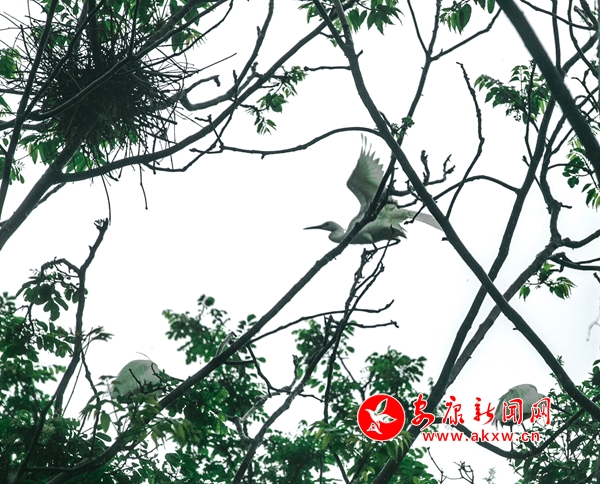 本网讯(记者 潘润生 实习记者 安琛)在建设中的高新区新时代大道施工现场,远远望去,有一片“突兀”的小树林,林中有30多个鸟窝,大量白鹭在树丛中引吭、飞舞。4月23日,大雨滂沱,记者在接到线索赶到这里时,就立刻被这雨中雪白的精灵震撼、吸引。