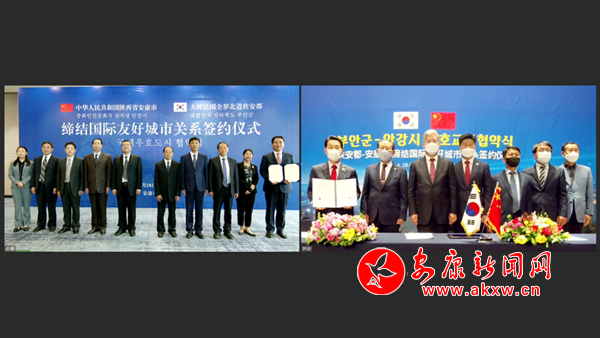 本网讯(记者 艾蓓 通讯员 梁石)4月28日,“中华人民共和国陕西省安康市和大韩民国全罗北道扶安郡缔结国际友好城市关系签约仪式”通过互联网线上举行,两地正式签署建立国际友好城市关系协议书。市长赵俊民、市人大常委会副主任周永鑫、市政府秘书长陈伍文,扶安郡郡守权翼铉、扶安郡议会议长文燦奇等嘉宾分别在两地出席签约仪式,中国驻韩国光州总领事张承刚应邀参加活动。