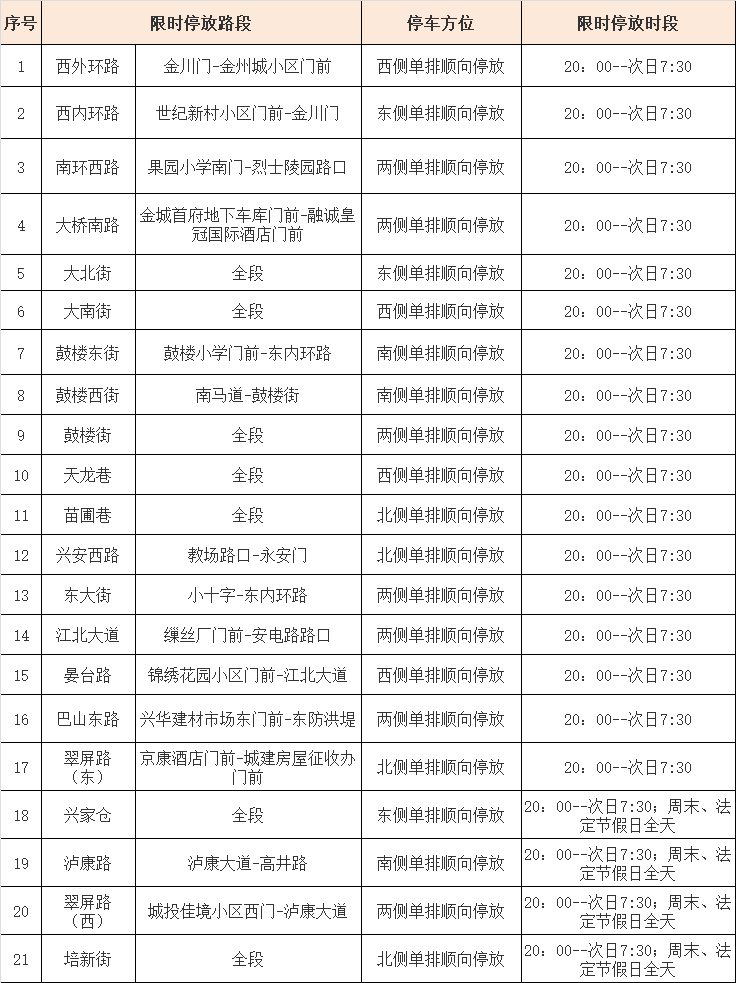 本网讯 5月31日,安康市公安局汉滨分局交警大队发布公告,为落实“我为群众办实事”公安交管12项便利措施,缓解城镇老旧小区“停车难”问题。经研究,自2021年6月1日起,安康城区17条路段准许夜间停放车辆,4条路段准许夜间、周末、法定节假日全天停放车辆。4Rs安康新闻网