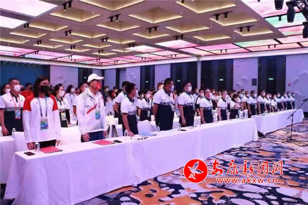 会议在庄严的国歌声中开始,全体运动员、教练员、技术官员身着队服,肃立齐唱国歌。