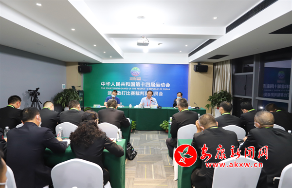 会议传达了《体育总局办公厅关于印发<第十四届全国运动会打分计点项目裁判员选派管理监督规定>的通知》,学习了国家体育总局领导在相关会议上的重要讲话精神,宣读了《第十四届全国运动会武术散打决赛裁判员赛风赛纪责任书》,全体裁判员现场签署、递交了赛风赛纪责任书。