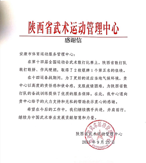 第十四届全国运动会武术散打比赛圆满结束,陕西省散打队敢打敢拼、作风硬朗,取得了2枚银牌1个第五名的佳绩。在十四运备战期间,我市克服疫情困难,为陕西省散打队的备战训练提供了优质的服务保障,让队员更好地适应安康气侯环境。感谢信中写道:“希望在今后的工作中,继续携手共进,并肩前行,为中国武术事业发展贡献智慧和力量。”7mL安康新闻网