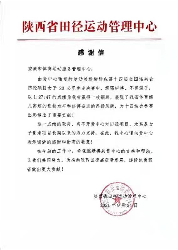 据了解,由安康市体育中心输送的安康籍运动员杨柳静在第十四届全运会田径项目女子竞走20公里决赛中为陕西省赢得一枚铜牌。感谢信中写道:“希望双方共同努力,为推动陕西田径高质量发展,建设体育强省做出更大贡献!”F4h安康新闻网