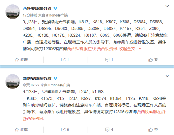 本网讯 据西铁安康车务段最新消息,9月28日,受强降雨天气影响,T247、k1063、K385、K1573、K15、T237、K997、k1574、k1064、T126、K118、K998等列车晚点时间较长,请旅客们注意站车广播,合理规划行程,在现场工作人员的引导下,有序乘车或进行退改签。具体情况可拨打12306咨询。