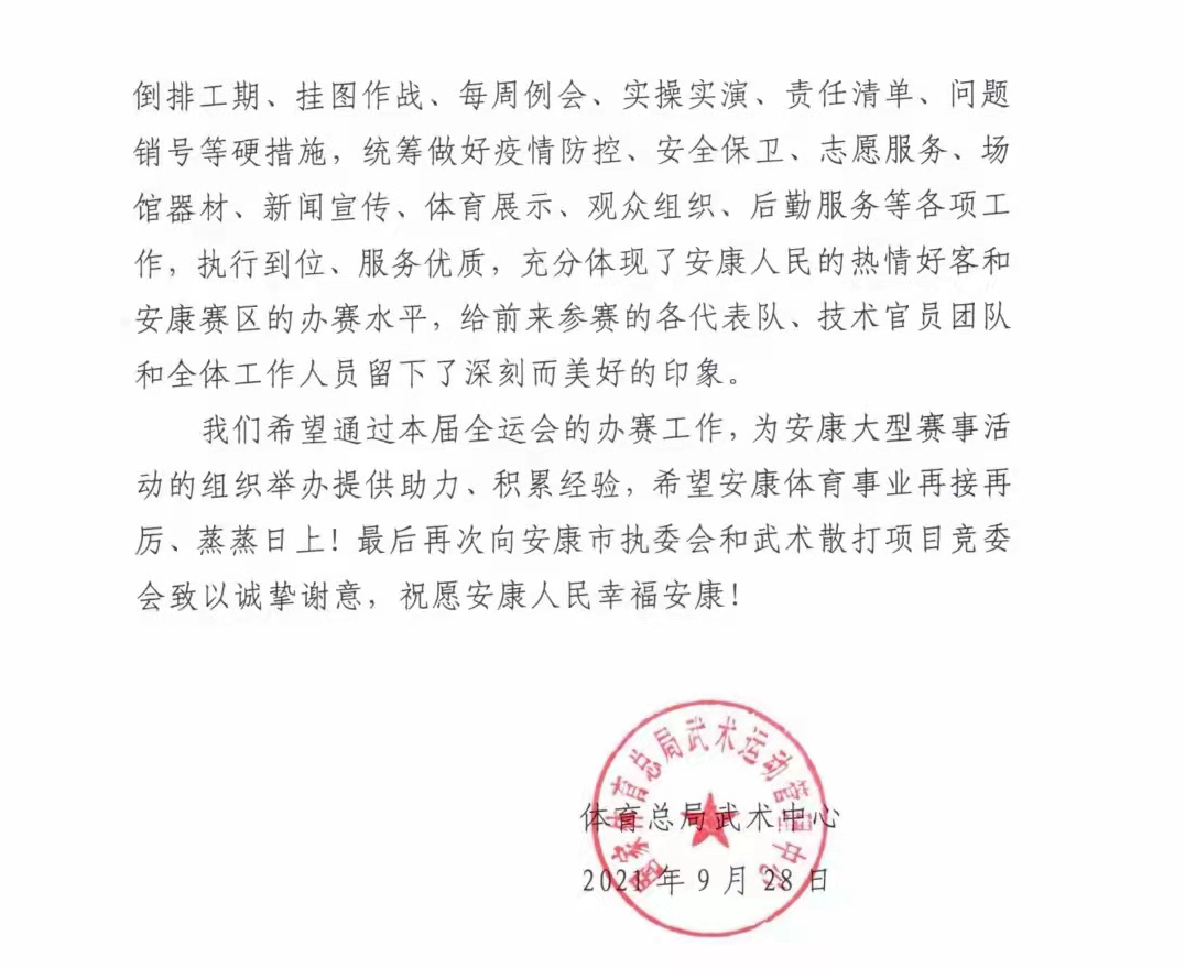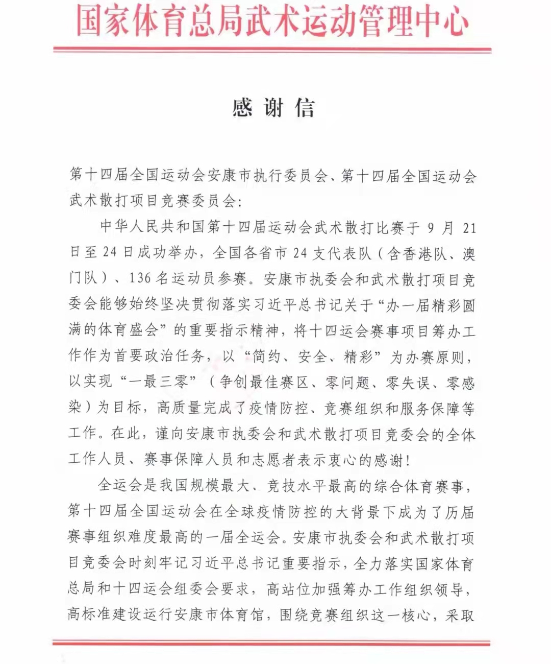 全运会是我国规模最大、竞技水平最高的综合体育赛事,第十四届全国运动会在全球疫情防控的大背景下成为了历届赛事组织难度最高的一届全运会。在十四运备战期间,我市克服种种困难,坚持统筹做好疫情防控、安全保卫、志愿服务等各项工作,感谢信中写道:“安康市执委会和武术散打项目竞委会执行到位、服务优质,充分体现了安康人民的热情好客和安康赛区的办赛水平,给前来参赛的各代表队,技术官员团队和全体工作人员留下了深刻而美好的印象。”