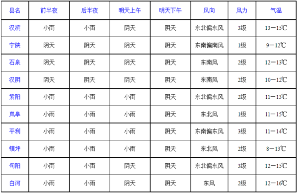 预计今天晚上阴天有小雨,明天白天阴天,南部小雨;12日阴天转多云;13日多云间晴天;14日多云转阴天;15日小雨转中雨;16日小雨转阴天;17日阴天转多云。WWh安康新闻网