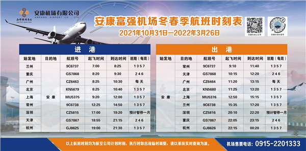 近日安康机场推出全新冬春季航班时刻表,2021年10月31日至2022年3月26日,安康机场将履行如下航班时刻,请广大市民根据实际情况合理安排出行计划,以免受到影响。