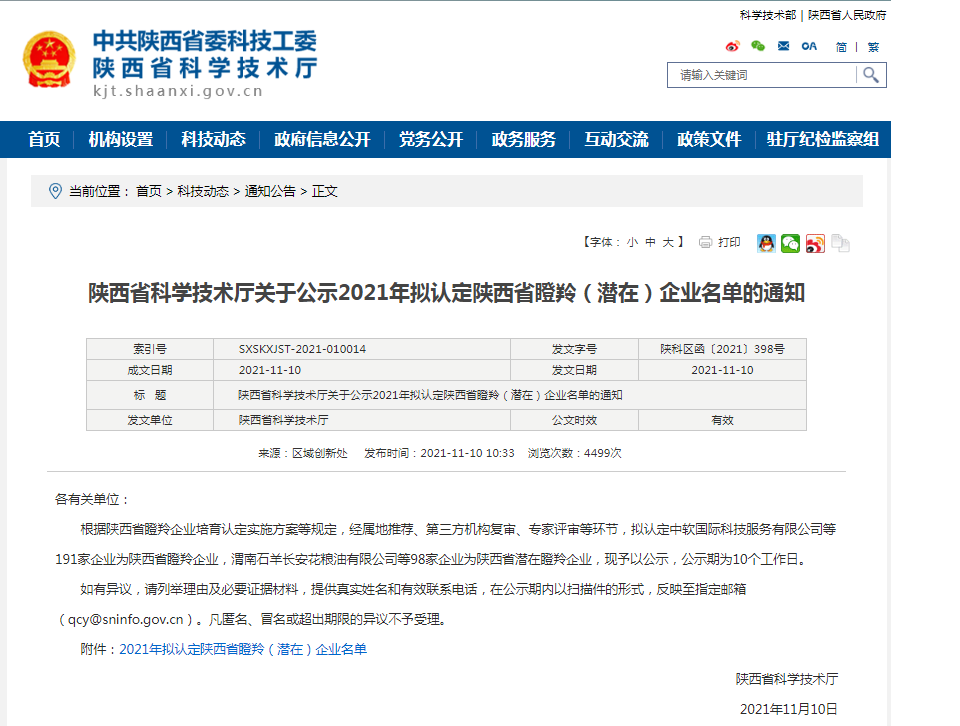 本网讯(通讯员 张凡) 近日,省科技厅公布2021年拟认定陕西省瞪羚(潜在)企业公示名单,安康市3家企业在列,其中陕西智宇寰宸医疗器械有限公司1家拟认定省瞪羚企业,陕西新智汇科技股份有限公司、陕西润农实业发展有限公司2家拟认定潜在瞪羚企业,我市省级瞪羚企业数量实现了新的突破。