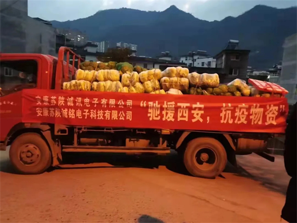 1月1日上午,11辆总价值121.8万元抗疫物资专车从汉滨驶出,中午时分到达西安雁塔区和航天基地。这批满载着广大民营企业爱心的蔬菜、猪肉、米面油、矿泉水、牛肉酱及汉滨特产将在当地统一调配下进入各大社区,用于保障社区居民的日常生活及安全防护。