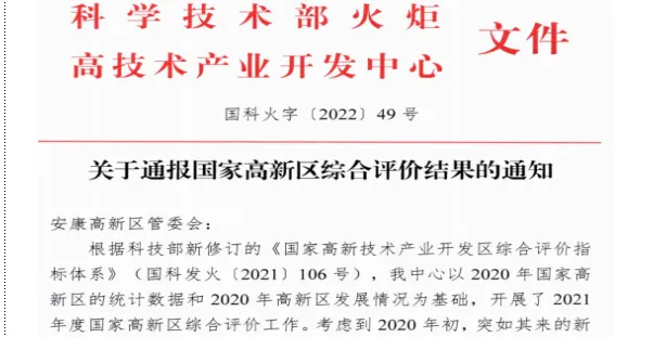 2月17日,国家科技部火炬中心公布了2021年度国家高新区评价结果:在全国157个国家高新区中,安康高新区综合排名再创新高,较2020年度提升5个位次,升至全国第58名,位列全省7家国家高新区第3名。