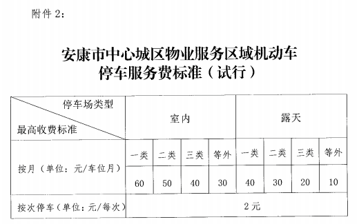 2、《安康市中心城区物业服务区域机动车停车服务费标准》(试行)。