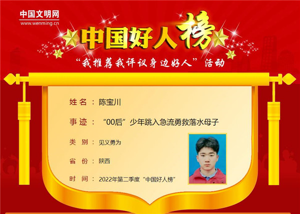 陈宝川,男,2003年10月生,西安医学院在校学生。2021年,刚参加完高考年仅18岁的他,在危急时刻无惧危险,毫不犹豫跳入水中,用双手托起了两个鲜活的生命,挽救了一个家庭。陈宝川曾获“陕西好人”称号。