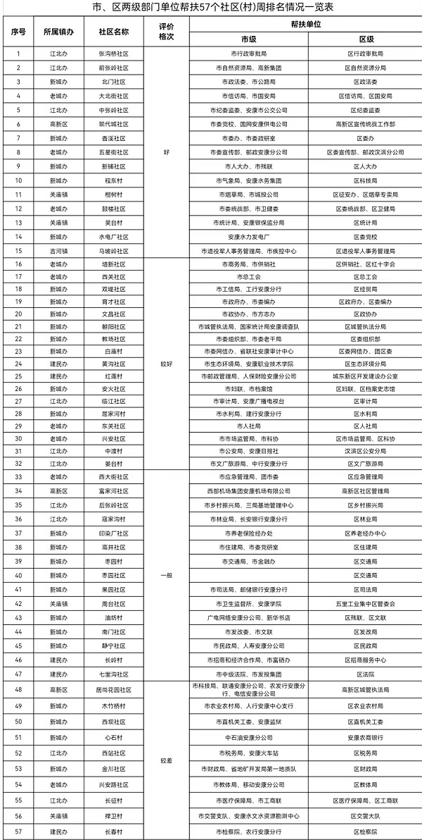 附:市、区两级部门单位帮扶57个社区(村)周排名情况一览表8Pa安康新闻网