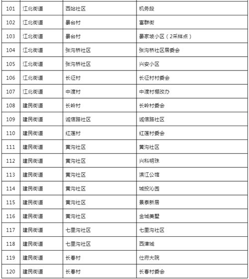 共设置120个采样点(见附件),由4个街道办事处统一安排采样点设置、人员组织、秩序维护,检测对象按照街道办事处要求,分时段有序到指定地点进行采样,避免人员聚集。
