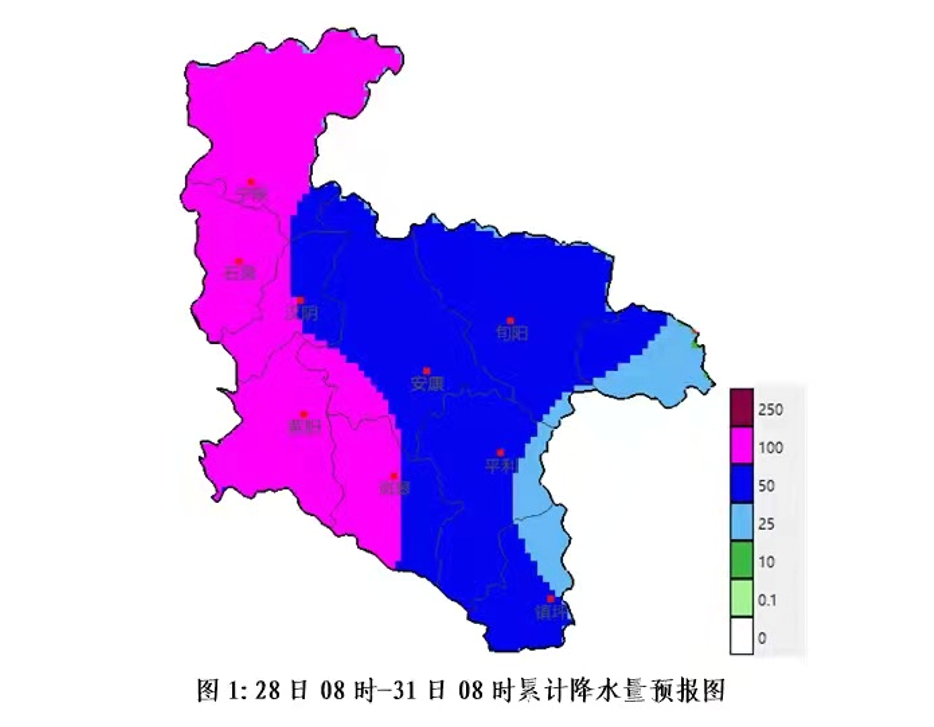 29日白天至夜间全市大雨(25~40mm),紫阳、岚皋、汉阴、 石泉、汉滨、旬阳、平利西北部、宁陕南部大到暴雨(40~75mm) ,紫阳西部、岚皋西部个别镇村有大暴雨(100~150mm)。