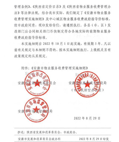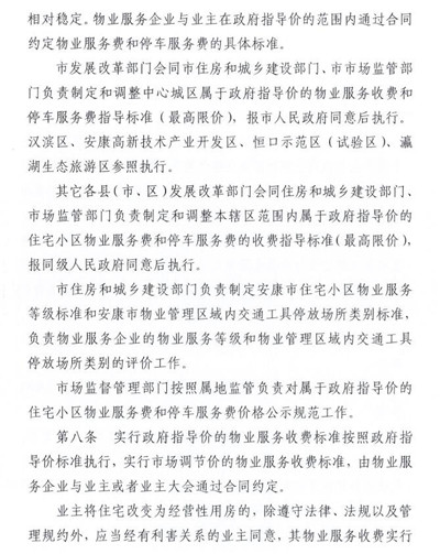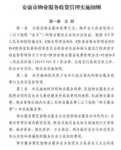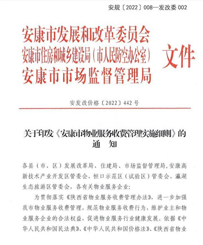 为贯彻落实《陕西省物业服务收费管理办法》,进一步加强我市物业服务收费管理,规范物业服务收费行为,维护业主和物业服务企业的合法权益,促进物业服务行业健康发展。依据《中华人民共和国民法典》、《中华人民共和国价格法》、《陕西省物业管理条例》、《陕西省定价目录》及《陕西省物业服务收费管理办法》等法律法规, 结合我市实际,我们制定了《安康市物业服务收费管理实施细则》及中心城区物业服务收费政府指导价标准,经市政府同意,现印发给你们,请遵照执行。各县(市、区)发改部门应会同相关部门尽快制定符合各地实际的前期物业服务收费政府指导价标准。