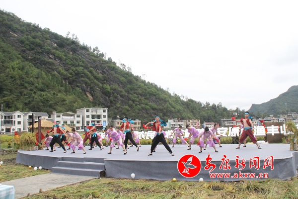 在纯净的背景下,舞蹈《欢天喜地庆秋收》、歌伴舞《开缸酒》、渔鼓道情《生态旅游兴旬阳》、小品《电商助农促丰收》、表演唱《群雁回归兴乡村》、《咱老百姓》、歌舞《追梦绿色向未来》等节目精彩上演, 独特的舞台形式将丰收盛景定格在画卷中,舞者起舞庆丰收,舞出了农人心中的喜悦,传递着农人丰收的幸福。