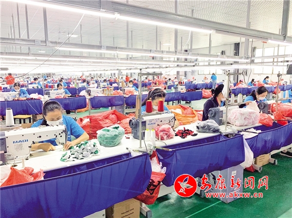 民主镇社区工厂的工人们正在缝制产品