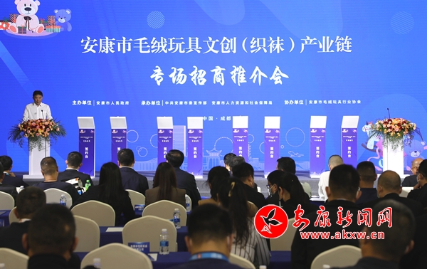 晚秋,蓉城。中国西部国际博览城9号大厅里座无虚席,气氛热烈。2022年11月1日3时许,安康市毛绒玩具文创(织袜)产业专场招商推介会如期召开。安康市常务副市长从中国玩具和婴童用品协会会长梁梅手中接过“建设毛绒玩具文创产业集群建设突出贡献奖”的金字牌匾时,大厅里响起经久不息的热烈掌声,许多人百感交集。