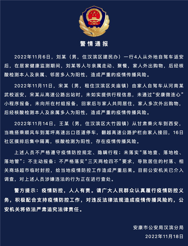 11月18日,汉滨区通报三起违反疫情防控工作典型案例