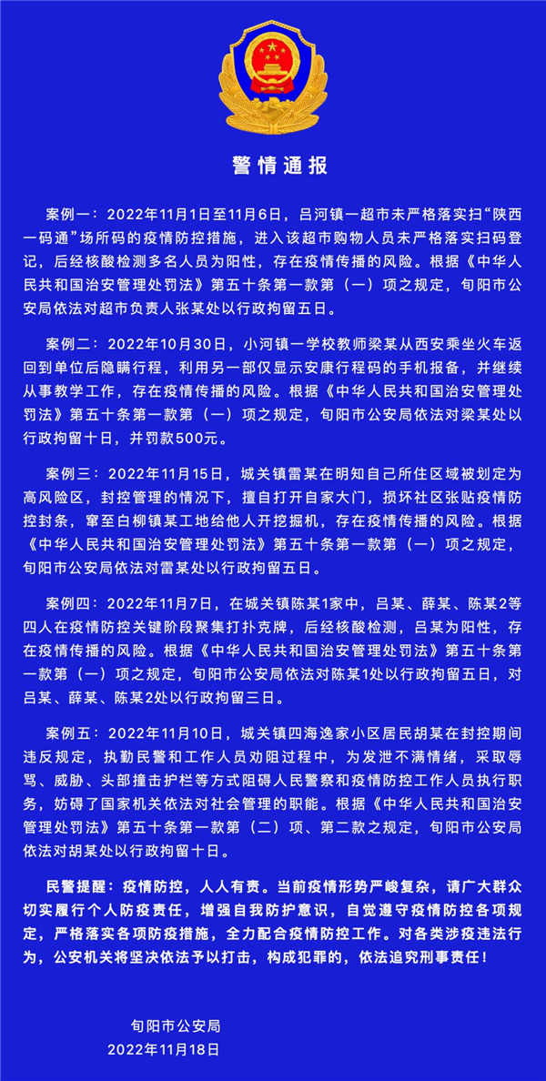 11月18日,旬阳市通报5起涉疫违法案件,依法处理8人