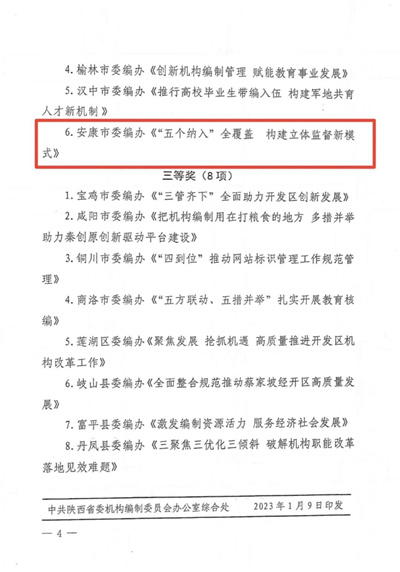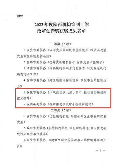 日前,2022年度陕西省机构编制工作改革创新奖评选结果揭晓,入选全省机构编制系统20项获奖成果中,我市3项改革创新成果斩获一等奖2名、二等奖1名,获奖等次和数量位居全省第一。
