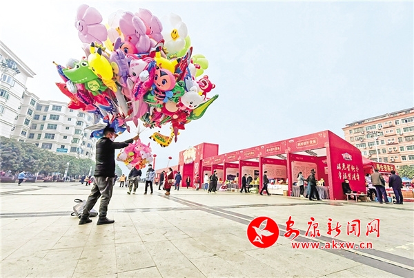 ④1月11日,“瑞兔贺新春·幸福紫阳年”年货节开幕,一名商贩举着气球前来“赶节”。